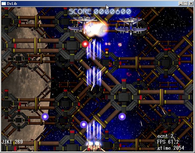 画像では全く伝わりませんが、自機狙い弾を撃ってきて、自機と敵、自機弾と敵、敵弾と自機の