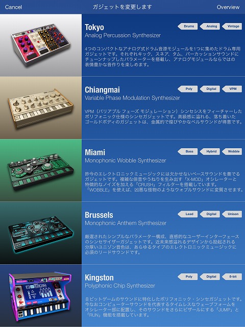 ガジェットと呼ばれる音源も豊富で音も良いので、ホントにiPadだけで曲作り
