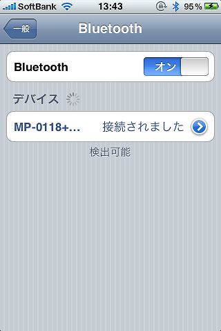 iPhoneの設定から一般を選んでBluetoothをオンにすれば機器の検索が始まります。