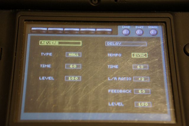 エフェクト操作画面、リバーブとディレイが使えますが同時使用は不可能です。