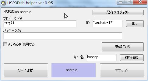 プロジェクト名は好きな名前。IDはそのまま変更せず。あと、HSP3Dish Helper(hsp3dh.exe)の使い方も良くわからなかったのですが