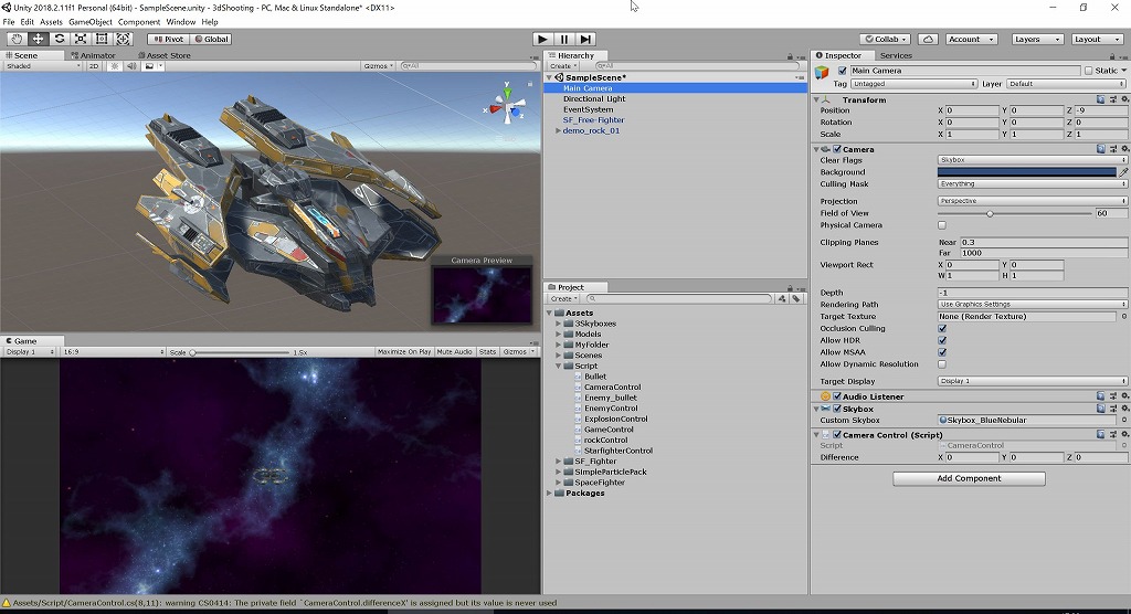 とりあえず、この作成した3Dシューティングを見下ろす感じのカメラ角度にして2.5Dシューティングとして作ってみようかなと思ってます。