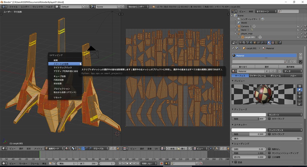 とりあえずUV展開する時は普通の展開ではなくスマートUV投影で行います。