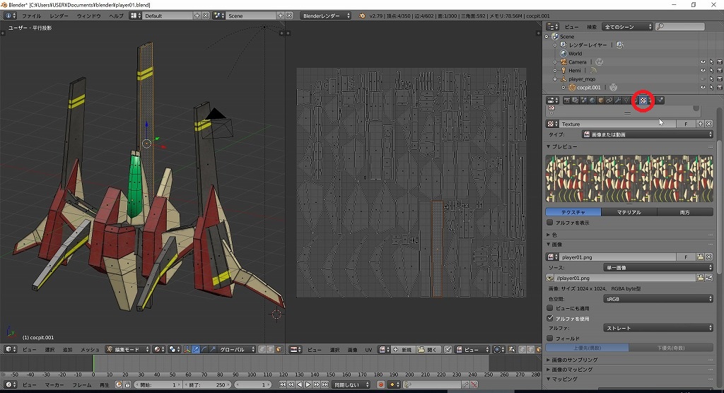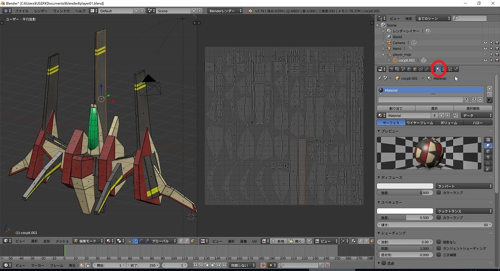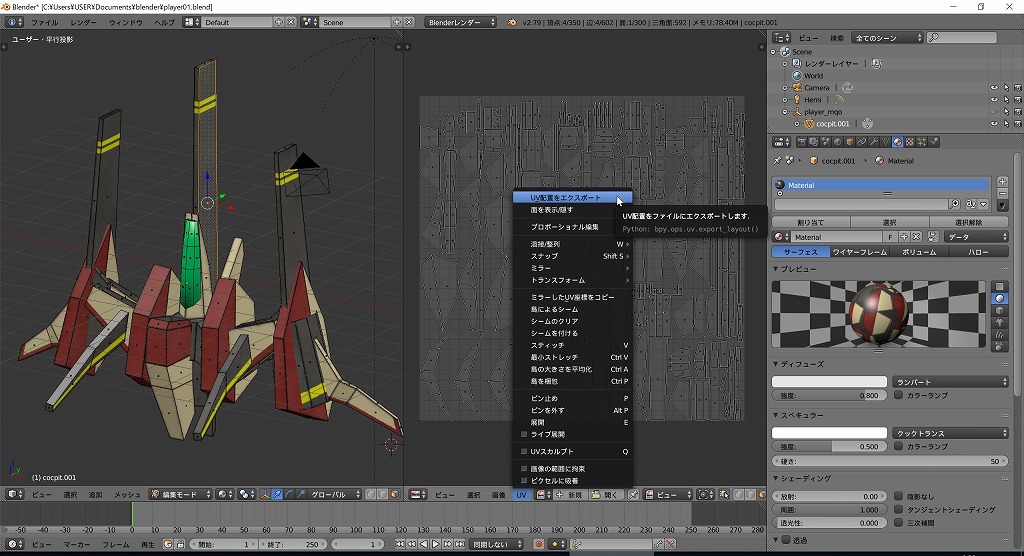 私が今まで制作していたモデルはテクスチャを使わずに素材に直接色を塗っていたので色を塗る為にモデルを分割しており非常に頂点数が多かったんです。なので出来るだけ頂点数を抑えつつモデルに色を付けるとなるとテクスチャを貼る方法が一番良さげなのでモデリングからやり直しましました。