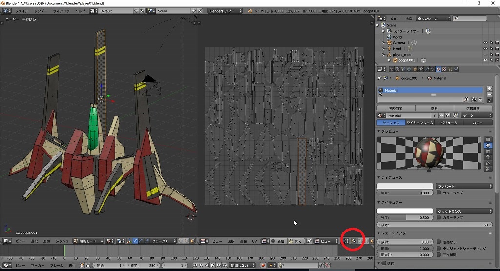 画像の丸のボタンを押すと編集モードのモデルと展開図の位置を表示してくれますので、どのパーツがどこの部品なのか一目瞭然です。