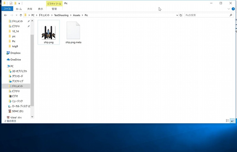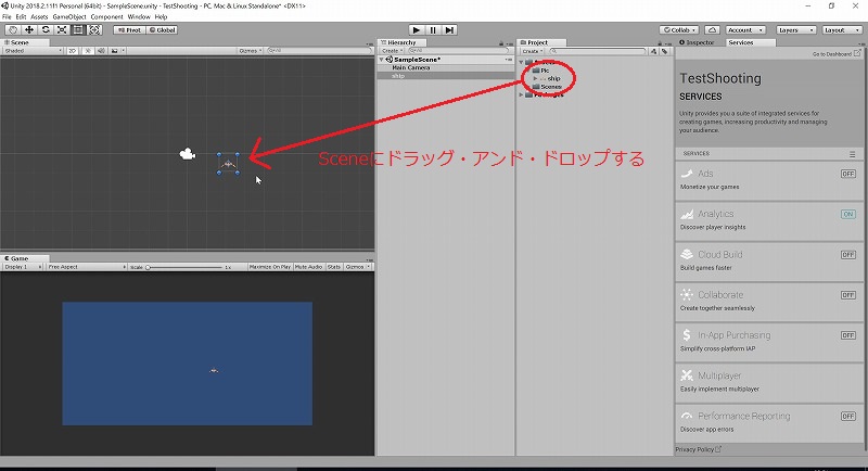 追加したship.pngをSceneタブにドラッグ・アンド・ドロップするとHierarchyタブにshipが生成されます。