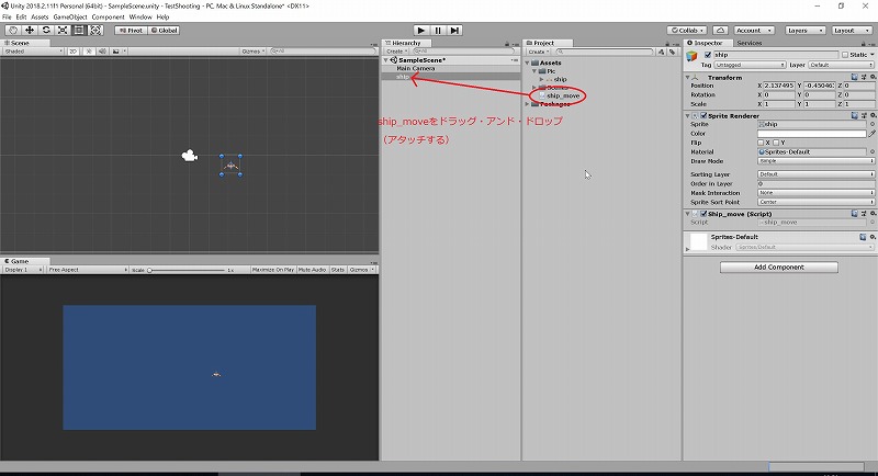 スクリプトを保存したらProjectタブにあるship_moveをHierarchyタブにあるshipにドラッグ・アンド・ドロップします。ちなみに、こんな感じでオブジェクトに色々と足していく行為をアタッチすると言うそうです。