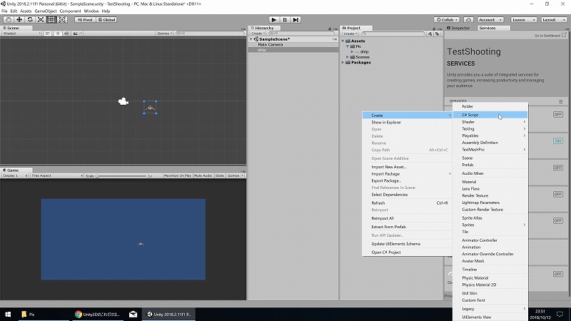 マウスカーソルをProjectタブに持っていって右クリック→Create→C# Scriptでスクリプトを作成。名前はship_moveとしておきました。