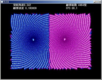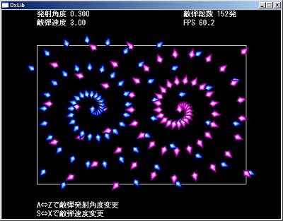 今回は2種類の弾を1発づつ角度を変えて毎フレーム発射します。