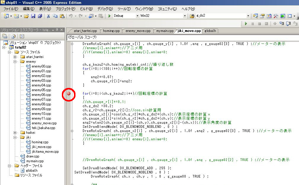 ブレークポイントを設定すると、設定した部分でプログラムが停止します。