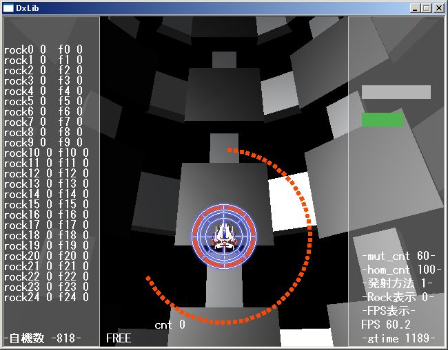 こんな感じで、画面の中を反転しながら動く弾画像を回転させながら表示して、Zキーを押すと