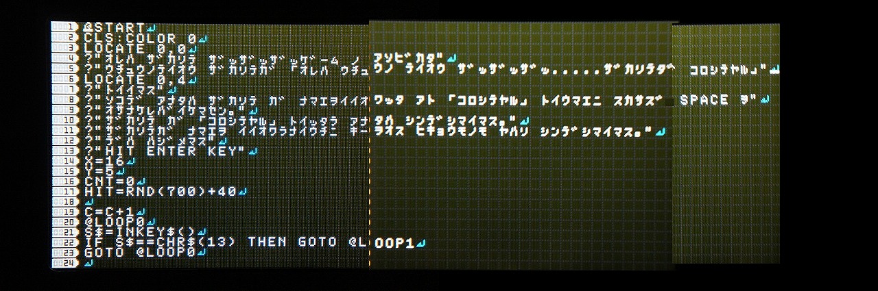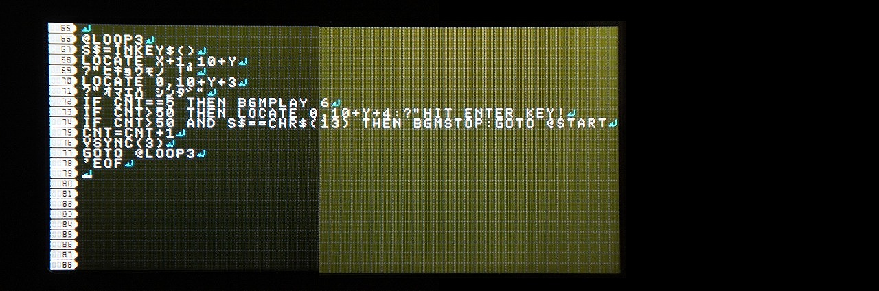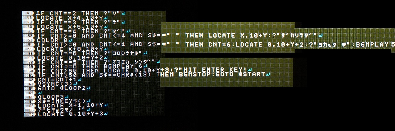 で、どうやんだ?と思っていたらI$=INKEY$():IF I$==CHR$(13)という感じでキャラ番号で