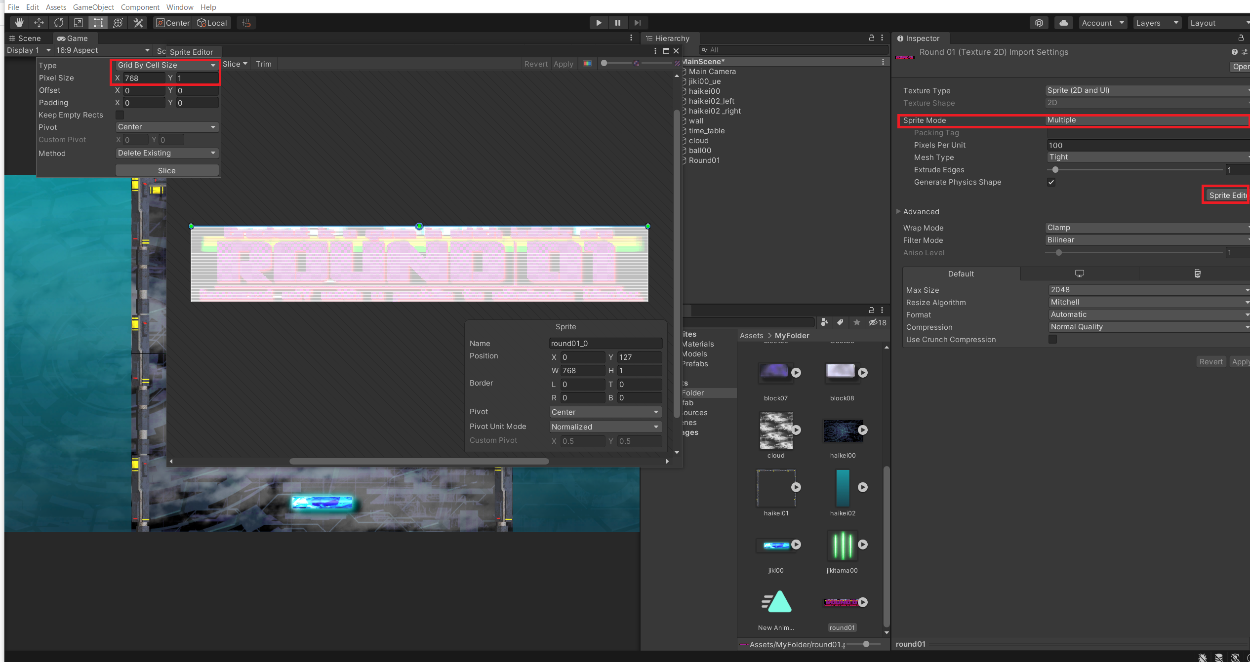 画像を選択したらInspectorのSprite ModeをMultipleに変更してからSprite Editorをクリックします。