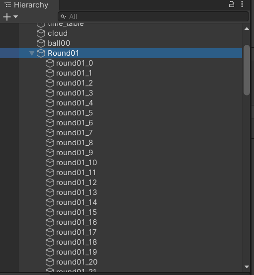 Hierarchyタブで右クリックから空のゲームオブジェクトを作成します。Round01と言う名前にしました。