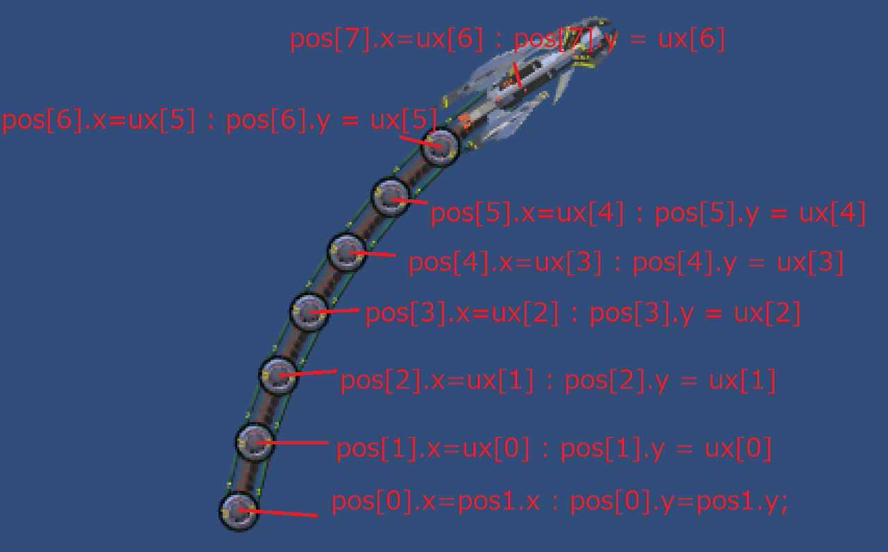このまま回転させてもファンタジーゾーンのウインクロンみたいな感じで腕は真っすぐのままなのですが、ここで各腕に回転させる角度を一定の間隔で少しづつずらしてプラスするとテトランのようにウネウネする感じで回転してくれます。
