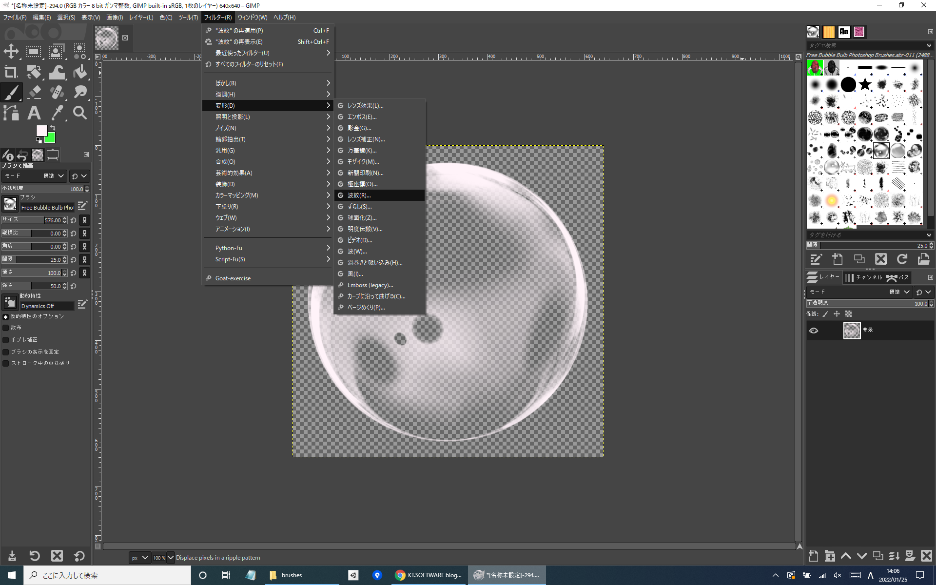 次にファイルメニューのフィルター>変形>波紋を選択。