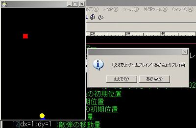 ■が敵、●が敵弾、▲が自機で、敵弾に当たるとリプレイを保存して、再生かゲームプレイかを