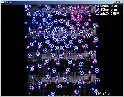 背景を2重スクロールさせて自機を表示し、3種類の敵弾を表示させています。