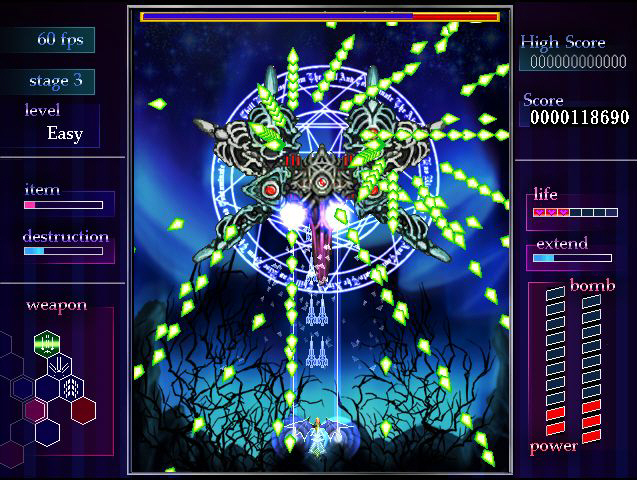 システムとしては3種類の武器とボムがあり、敵を沢山倒すとパワーアップする模様。
