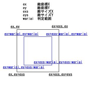 上記のプログラムの当たり判定処理はこんな感じになってます↓
