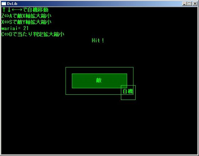 自機と敵当たり範囲が当たると”Hit!”と表示します。