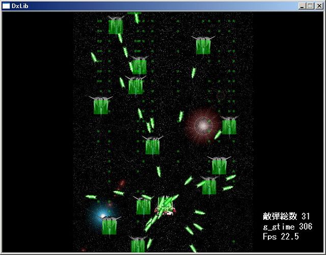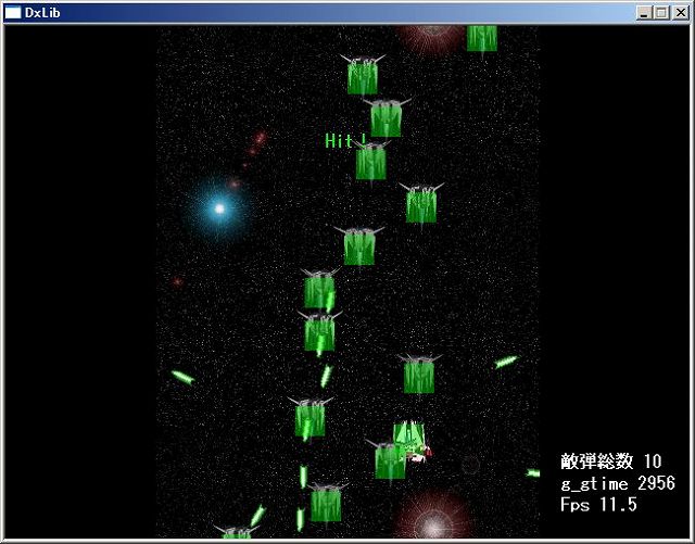 調子に乗って、敵弾と自機の当たり判定も作ってみたのですが、実装方法は同じはずなのに