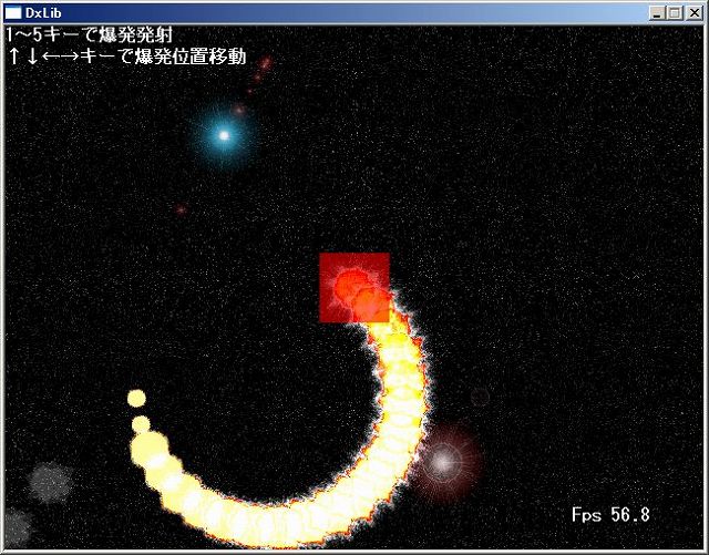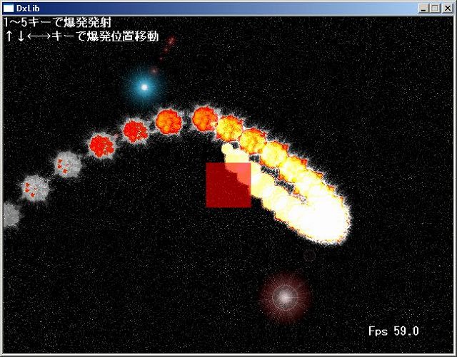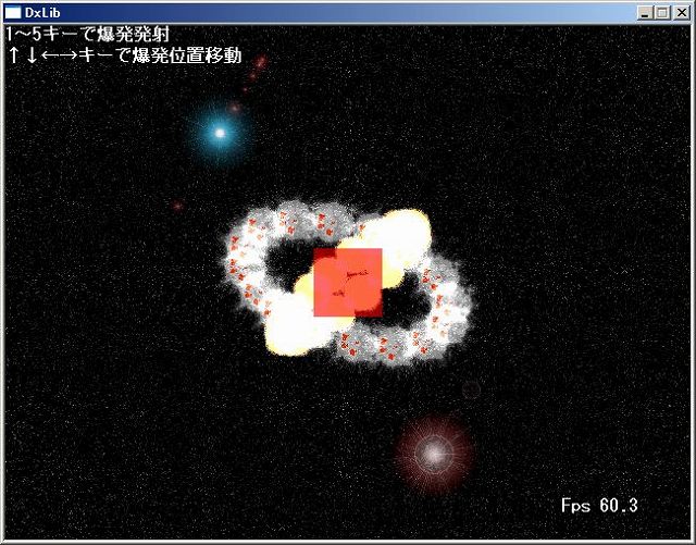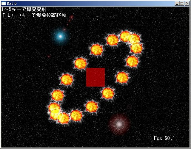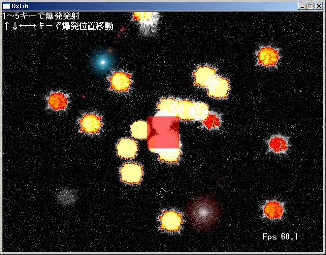 1キーを押すと上の画像のような感じで、一つの爆発が上下左右に移動していきます。