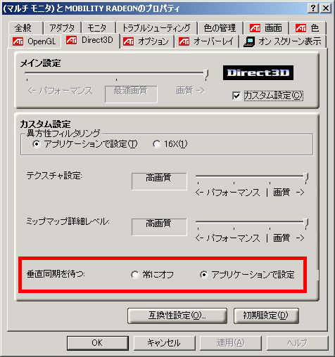 このDirect3Dの垂直同期(VSYNCとか言う奴ですね)の設定が「アプリケーションで設定」になっていると不具合が出るんです。