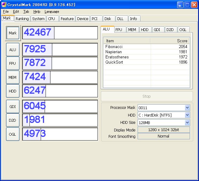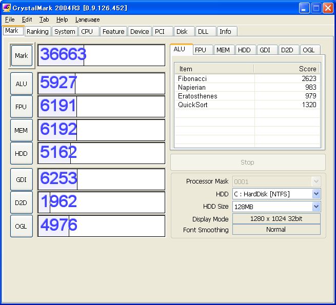パワーアップを行うとやりたくなるのがベンチマークって事でCrystalMark 2004R3
