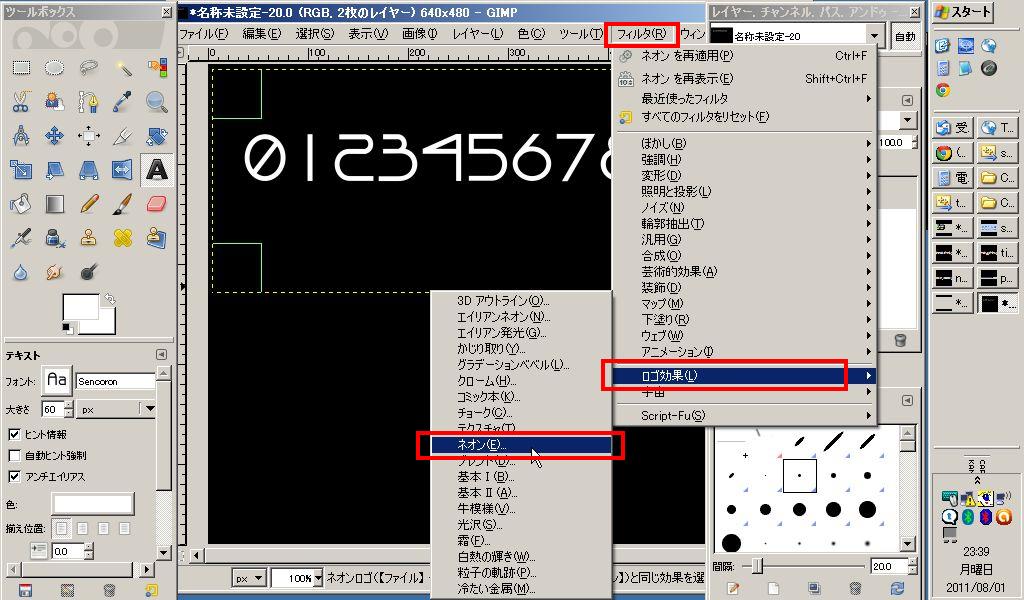 次にフィルタ→ロゴ効果→ネオンを選択します。
