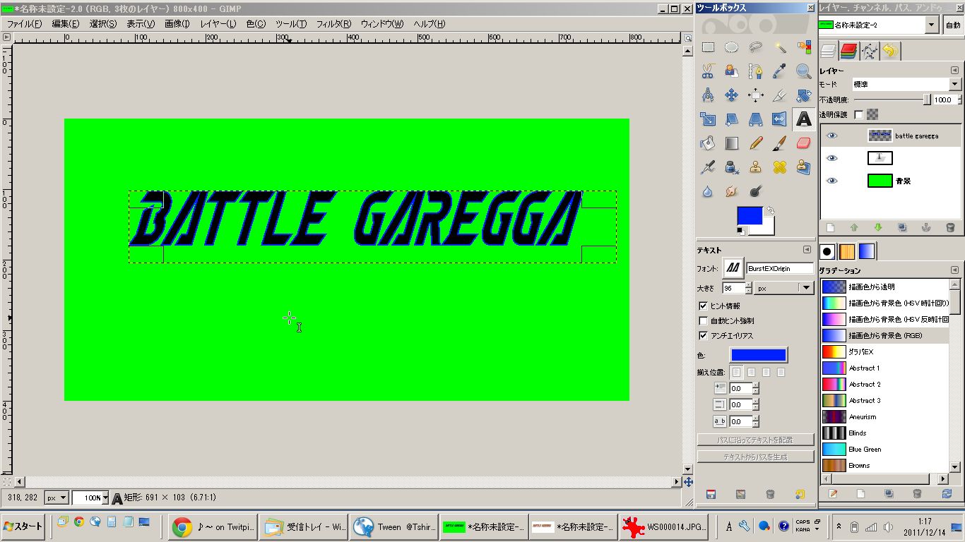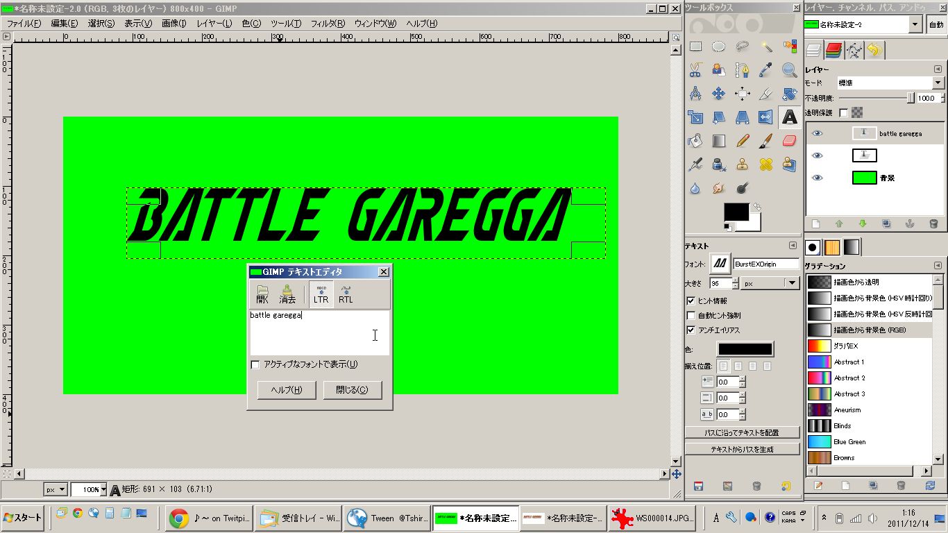 フォントをBURSTEXにしてテキストボックスに書きたいテキストを入力したら、ツールボックスの