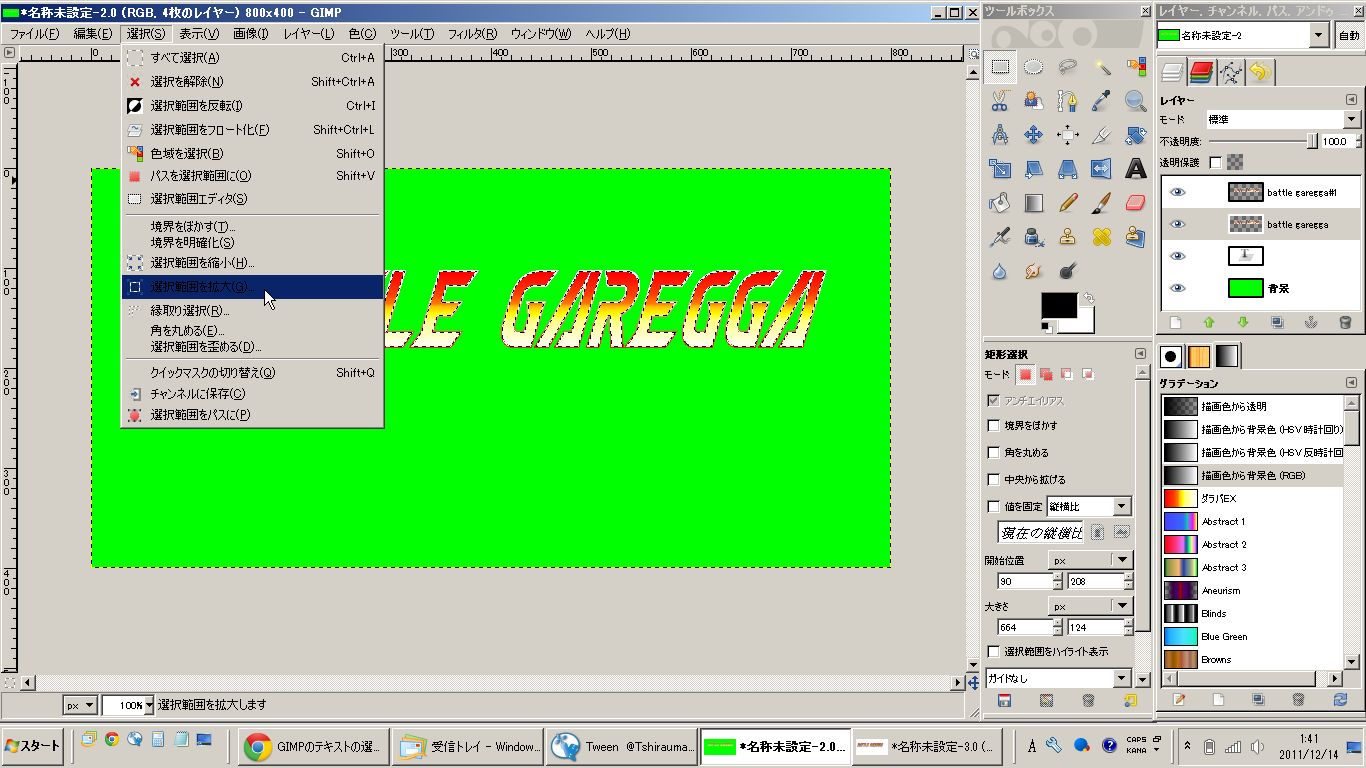 すると文字の縁が選択されますので、メニューの選択→選択範囲の拡大を選びます。