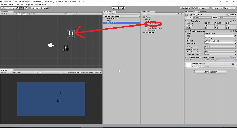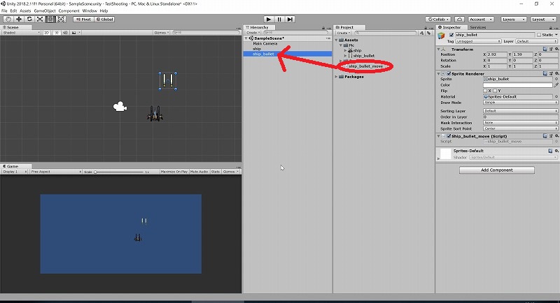 スクリプトを保存したらProjectタブにあるship_bullet_moveスクリプトをHierarchyタブにあるship_bulletにアタッチします。