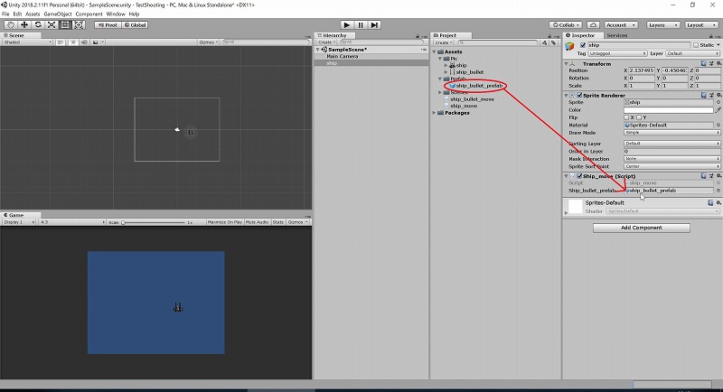 上記のスクリプトを保存してHierarchyタブのshipをクリックするとInspectorタブのship_moveスクリプト内にShip_bullet_prefabタブが出来ているので、そこにProjectタブにあるship_bullet_prefabをドラッグ・アンド・ドロップします。