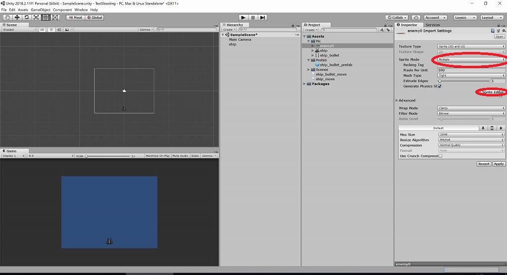 追加した画像をUnityで選択してInspectorのSprite ModeをMultipleに変更してからSprite Editorをクリックします。