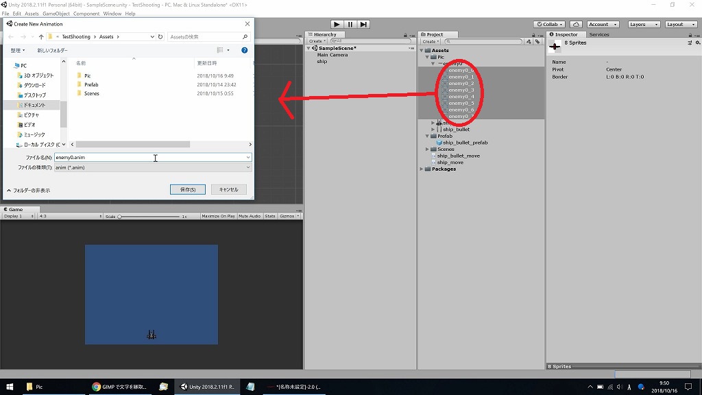 分割した画像を全て選択してSceneタブにドラッグ・アンド・ドロップするとアニメファイルを保存するタブが出てきますので任意の名前(今回はenemy0.anim)で保存します。