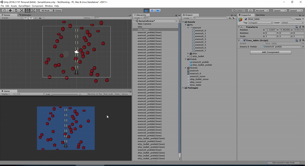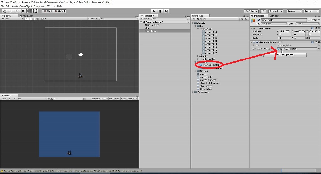 アタッチしたtime_tableを選択するとInspectorにenemy0_prefabタブが出来ているのでそこにProjectタブのenemy0_prefabをドラッグ・アンド・ドロップ。