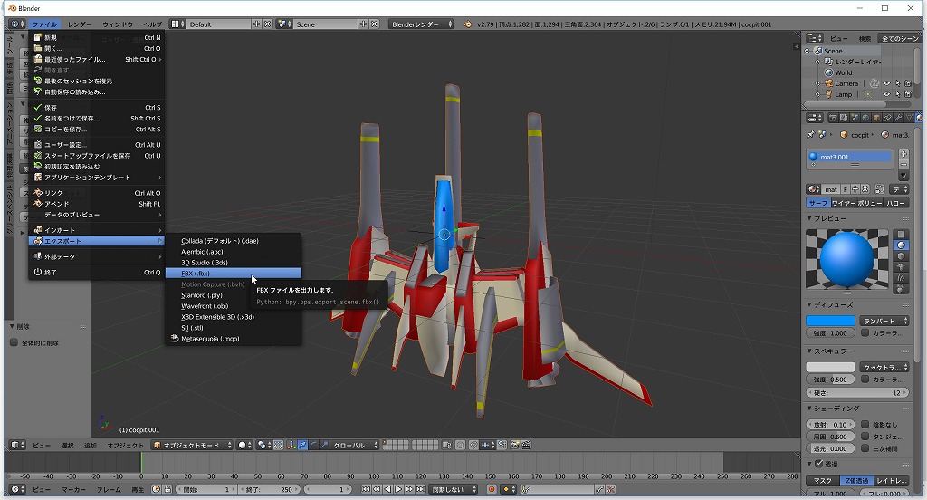 ファイルメニューのエクスポートでfbxに変換します。