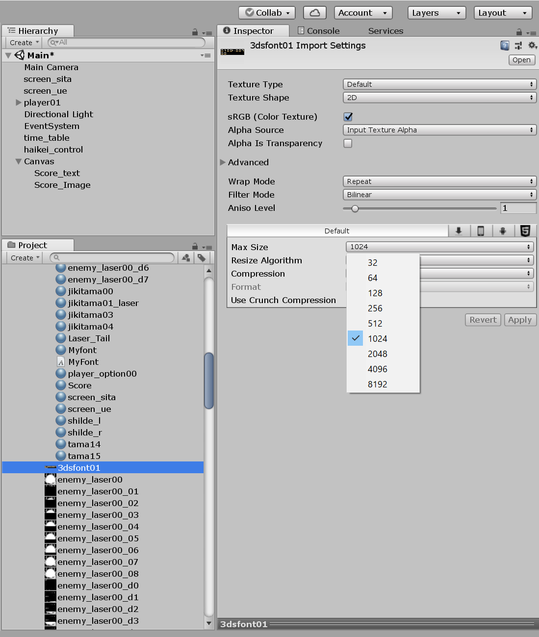 Max Sizeは512にしてApplyを押します。