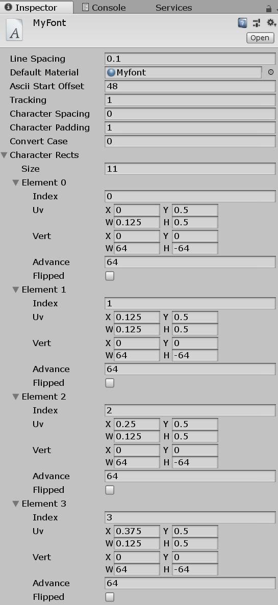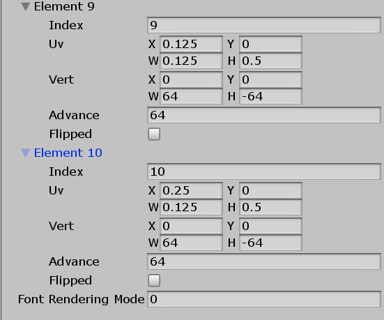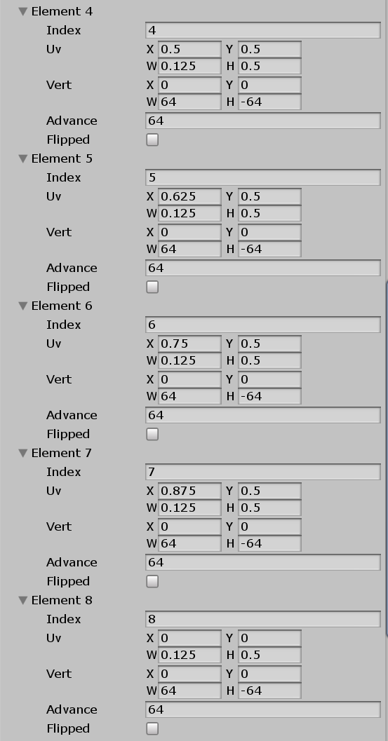 上記画像の場合は全体画像サイズが512x128で一文字のサイズが64x64ですのでXは64÷512で0.125、Yは64÷128で0.5となります。