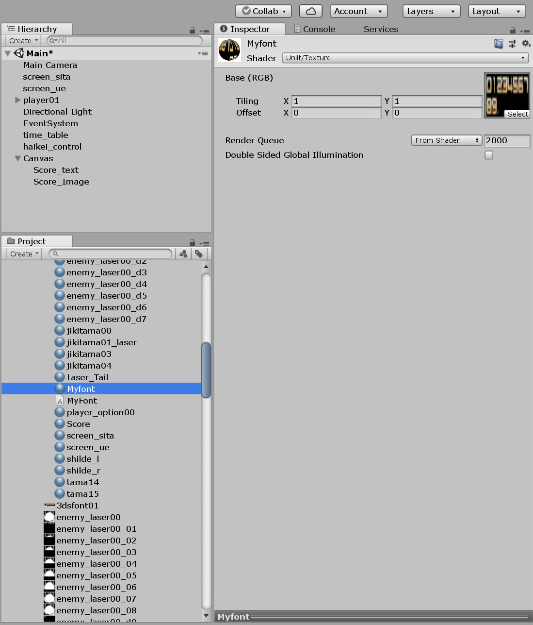 例えば1230点というスコアを表示しようと思ったらスコアの変数から数字の桁数を調べて、一の位が0だから0の画像を一の位の位置に表示、十の位は3だから3の画像を十の位の位置に表示・・・と言った感じで結構面倒くさい処理を行わないと駄目なんです。